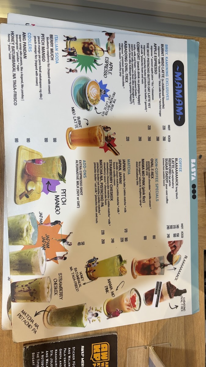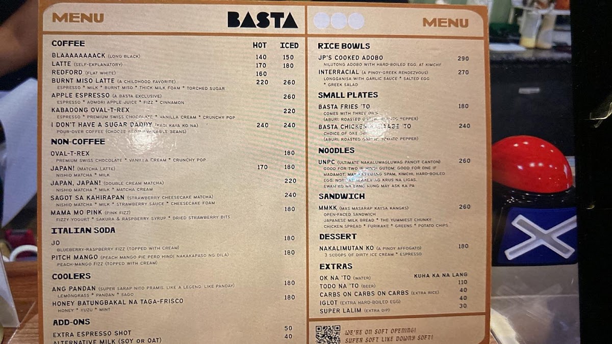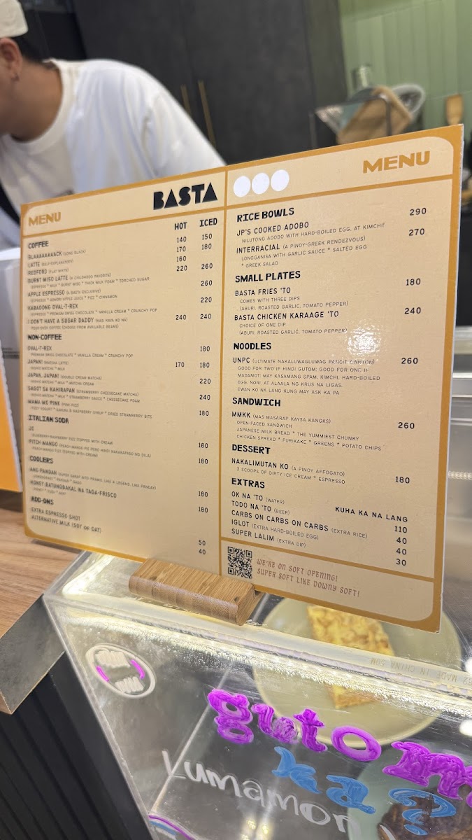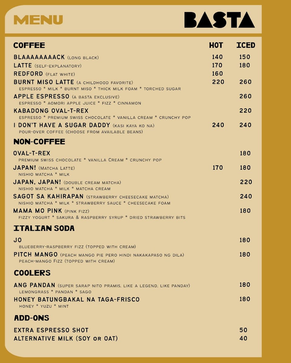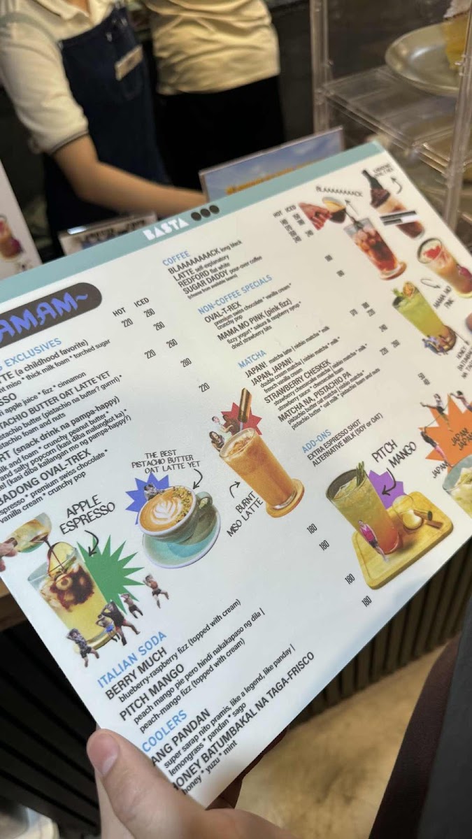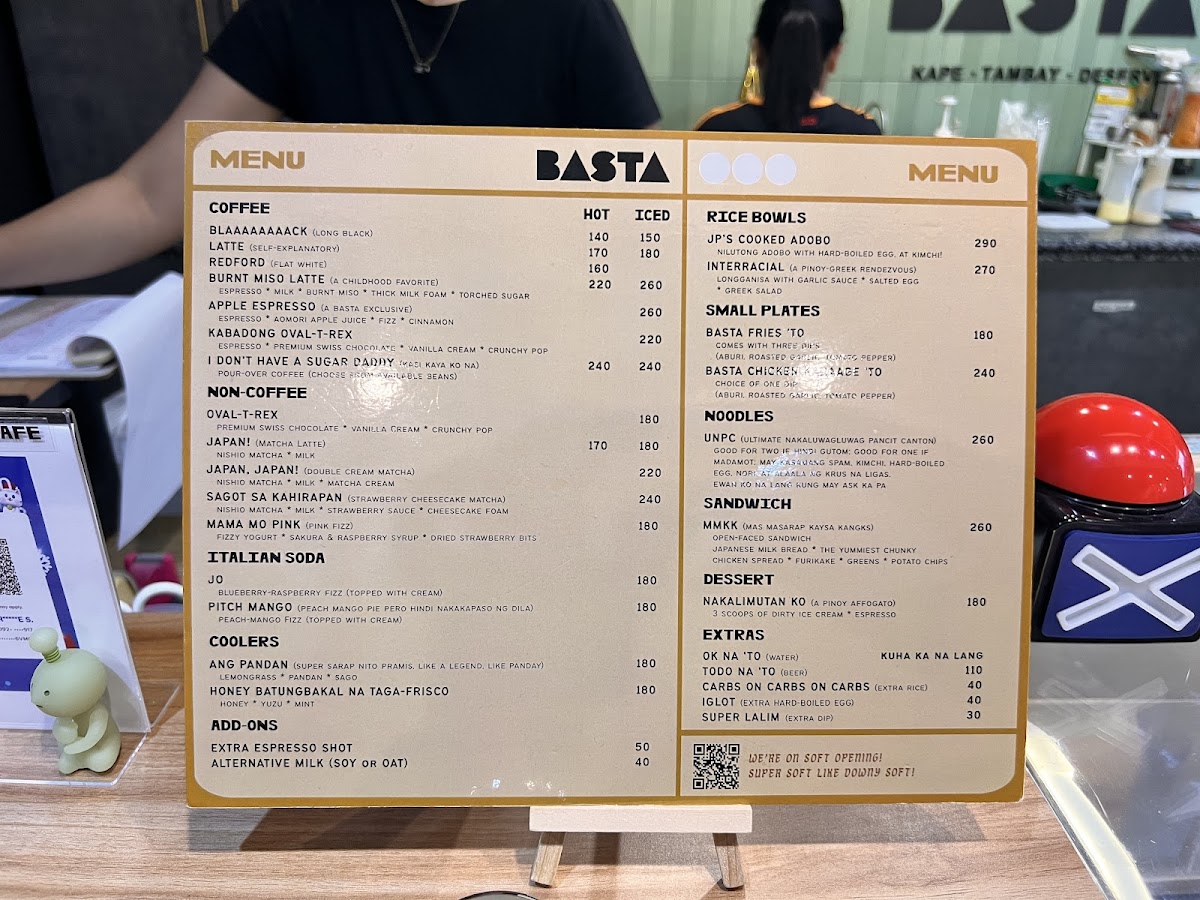 The menu at Basta Cafe offers a variety of selections encompassing beverages, noodles, and desserts. The drink options include unique iced non-coffee specials such as the Mama Mo Pink, a pink fizz made with fizzy yogurt, sakura, raspberry syrup, and dried strawberry bits, as well as the OvalTRex, which features premium Swiss chocolate, vanilla cream, and crunchy pop. These beverages are suitable for cold weather breaks or casual refreshment.