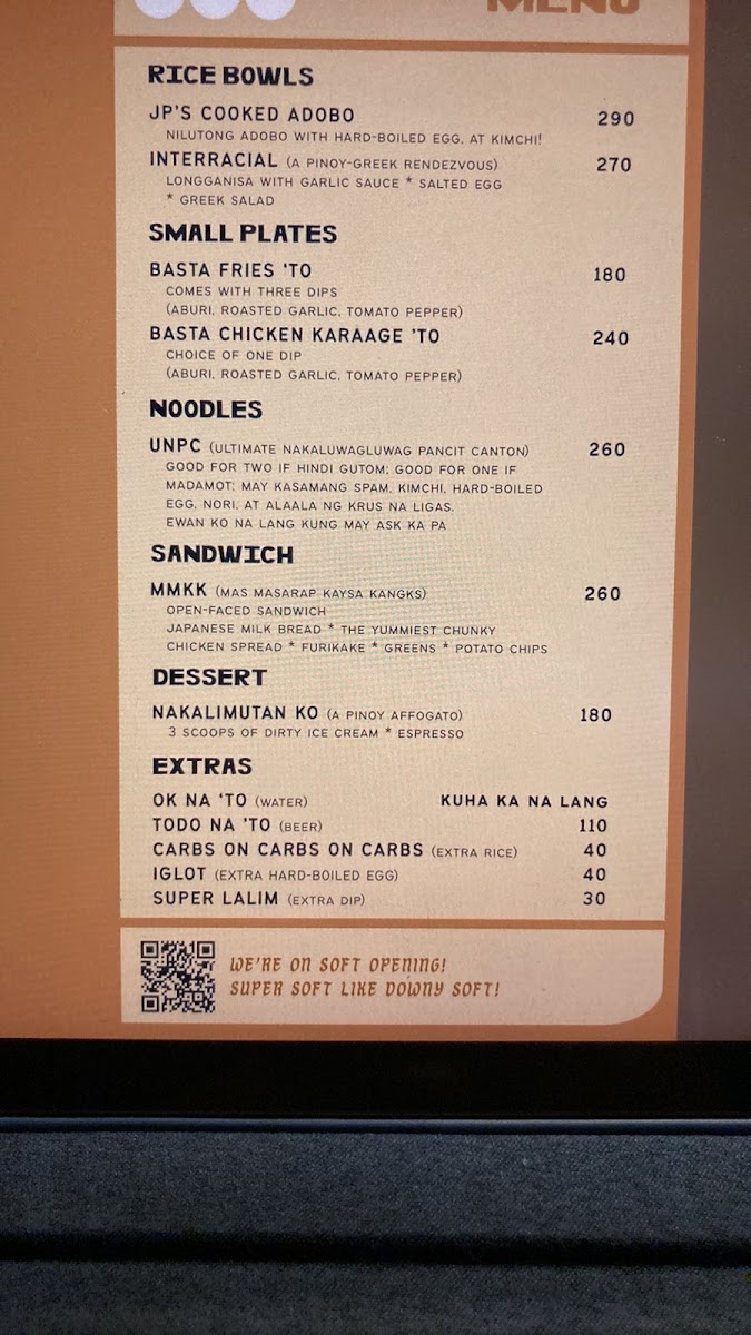 For heartier options, the menu features noodle dishes like the UNPC Ultimate Nakaluwagluwag Pancit Canton. This dish includes spam, kimchi, hardboiled egg, and nori, and is designed to serve either one or two people depending on appetite, making it a practical choice for light meals or shared dining.
